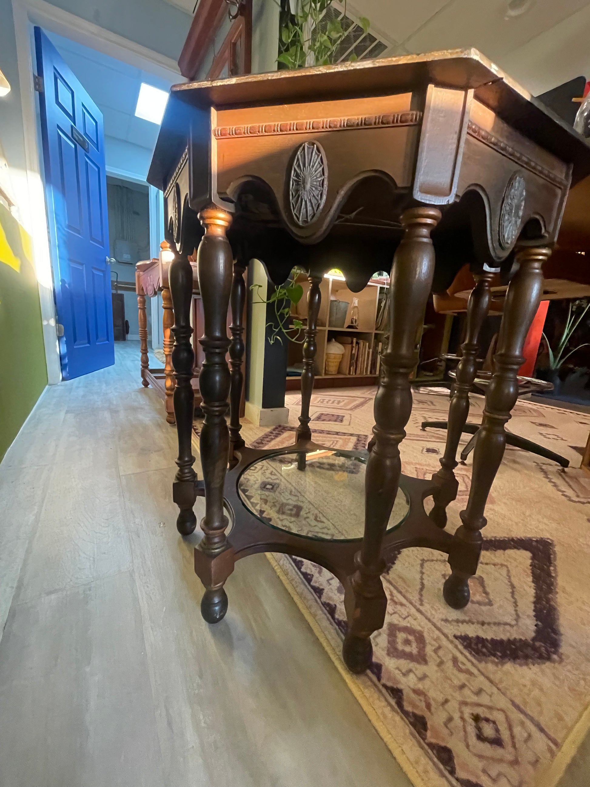 Antique Wooden Octagon Table- Imprinted and Original Glass