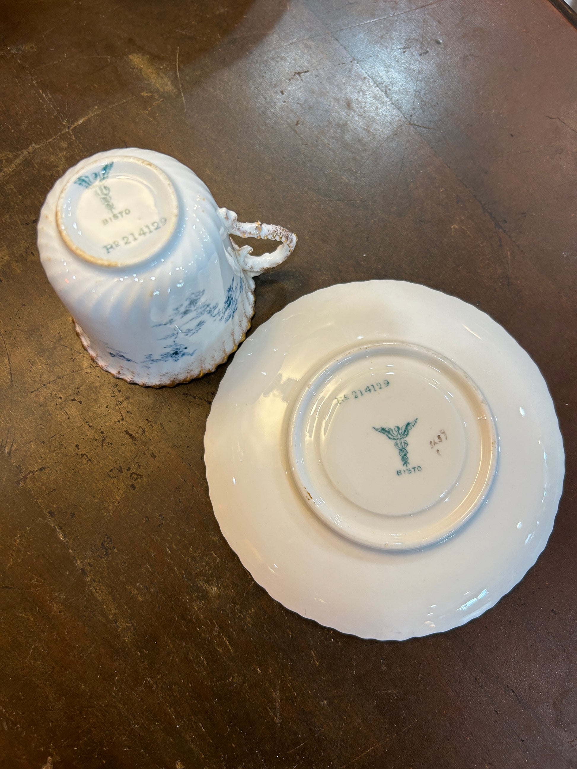 Bisto Bishop and Stonier Bone China Blue Flowers Gold Gilded Trim Demitasse Teacup and Saucer Set