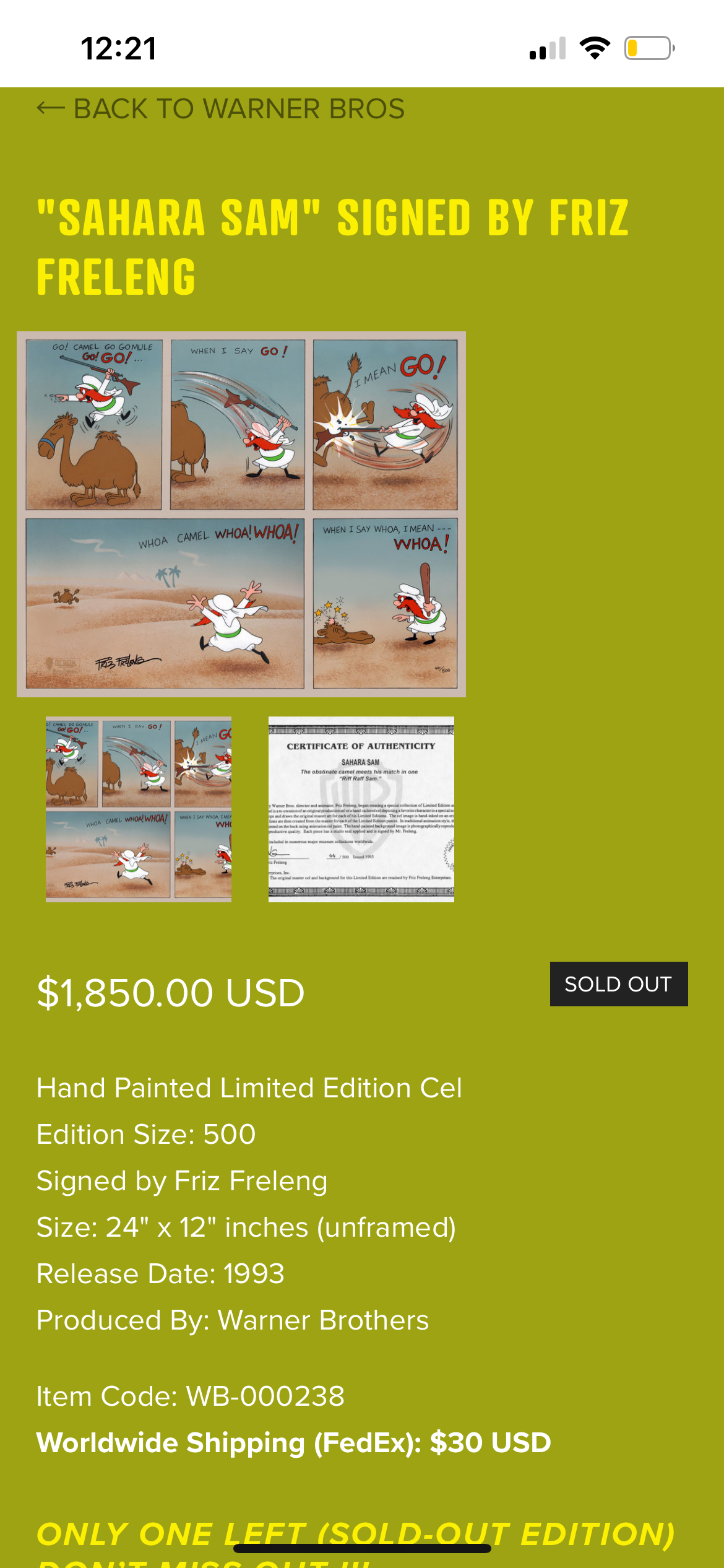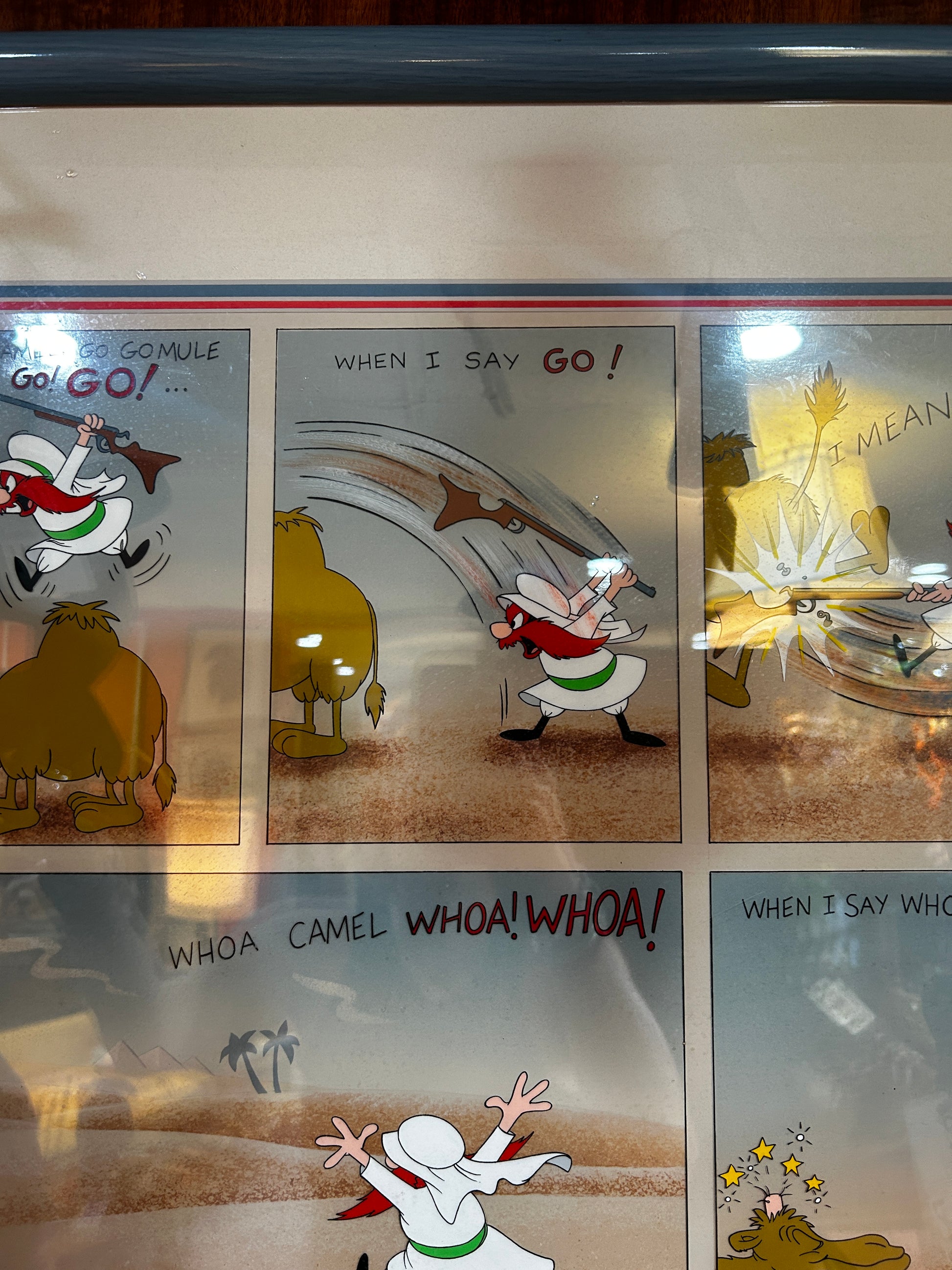 From the Warner Bros. Friz Freleng Masters Collection, this famous scene depicts in comic strip format Sahara Sam as Rif Raf Sam and his meeting with an obstinate camel inspired by a scene from the 1955 short, Sahara Hare. When Sam says Whoa!...he means Whoa!.