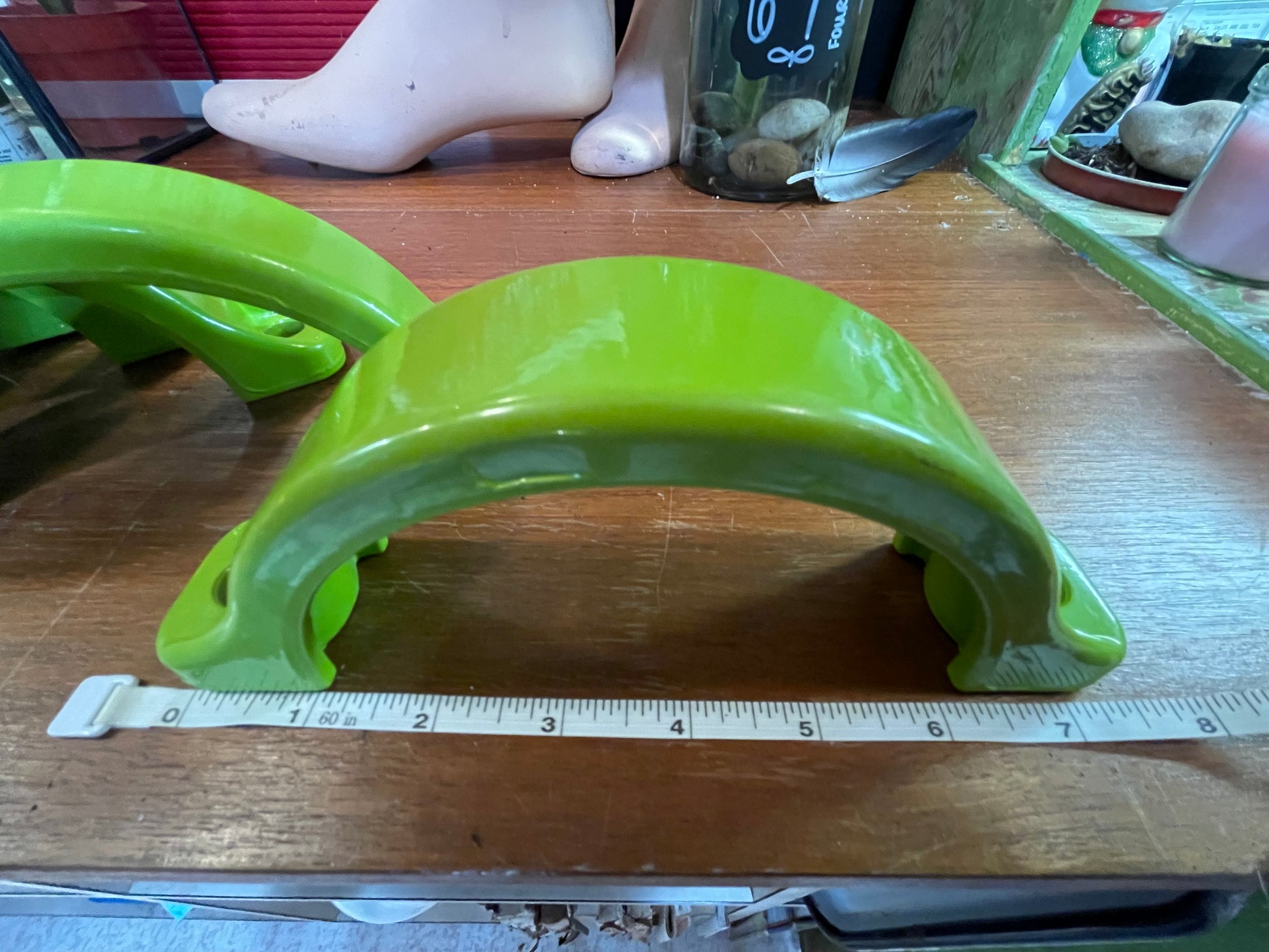 Sizes in pictures. These bad boys are huge. They are the perfect ironic handle on an old piece. They are big enough to fasten to the wall and use for towel holders by the pool or in a funky bathroom that needs a pop of color. Buy em now, stew on em for a bit or take the plunge into the deep pool of handle choices and just commit to the big boys.