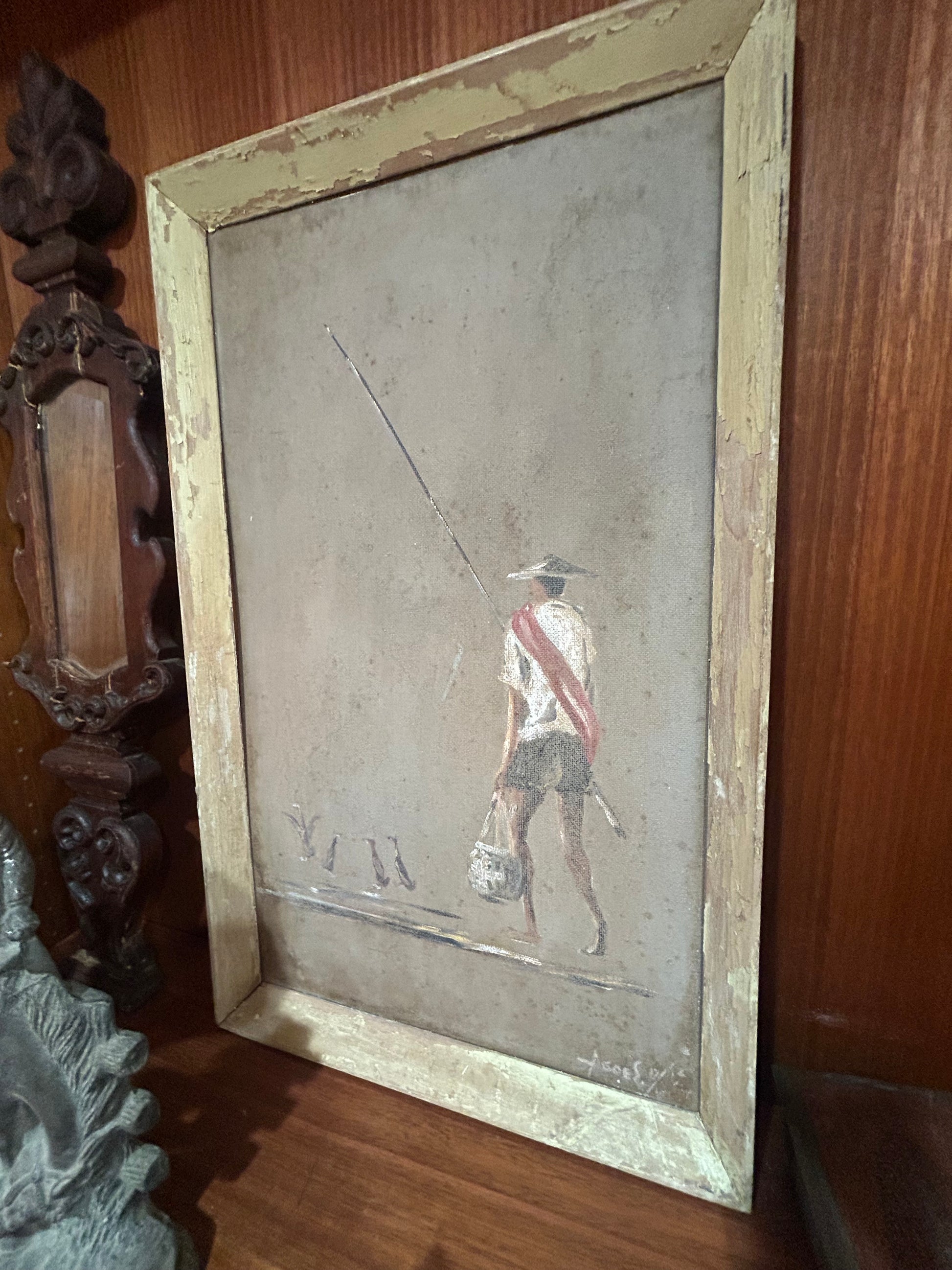 Beautiful, simple, original painting. Man, fishing pole, ducks.
