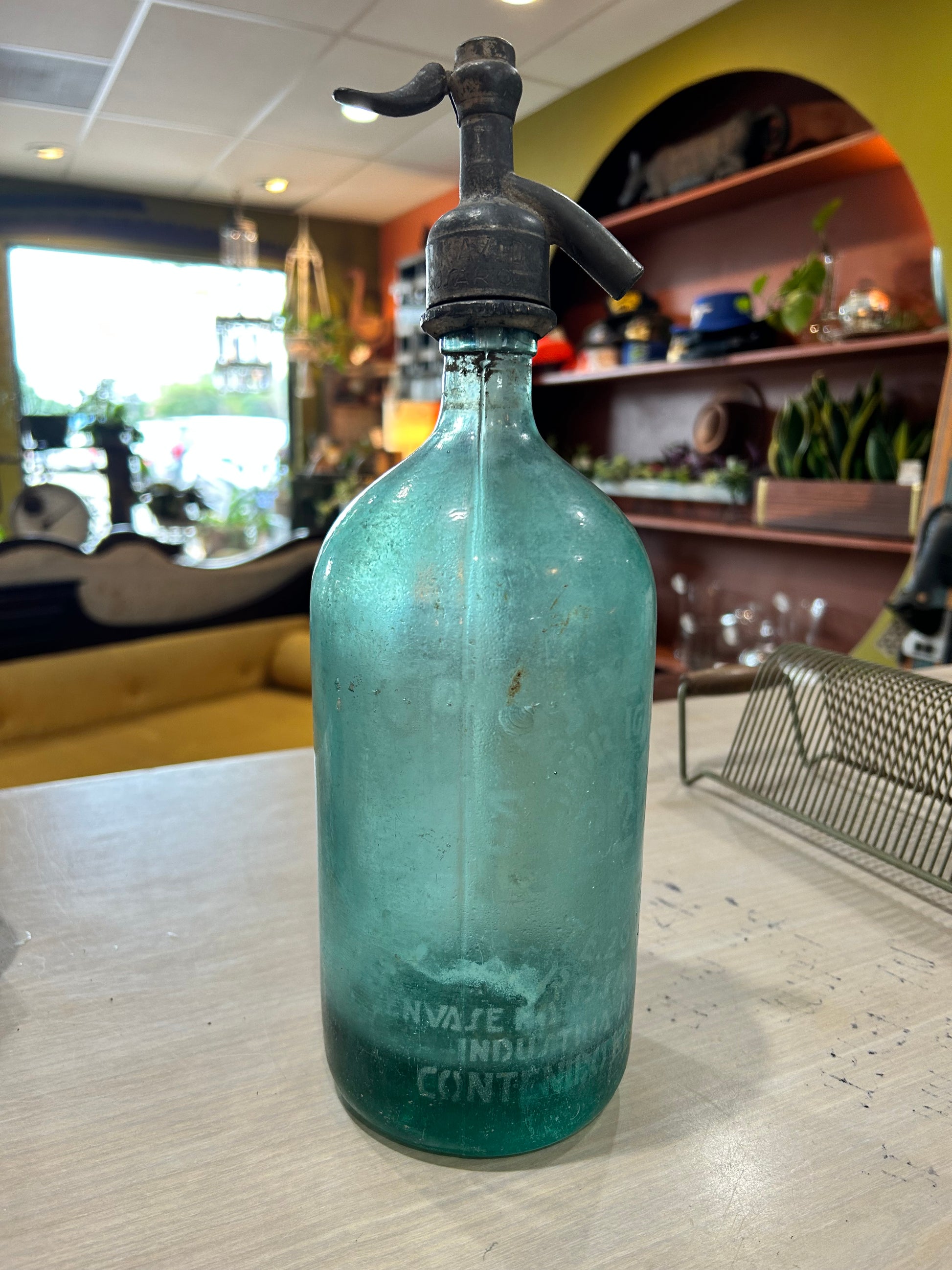 This glass is an amazing addition to any collection but can also stand alone. The patina handle matches the wear of the rare aqua color glass. Bar decoration? Bathroom soap dispenser? Book end? Your choice!