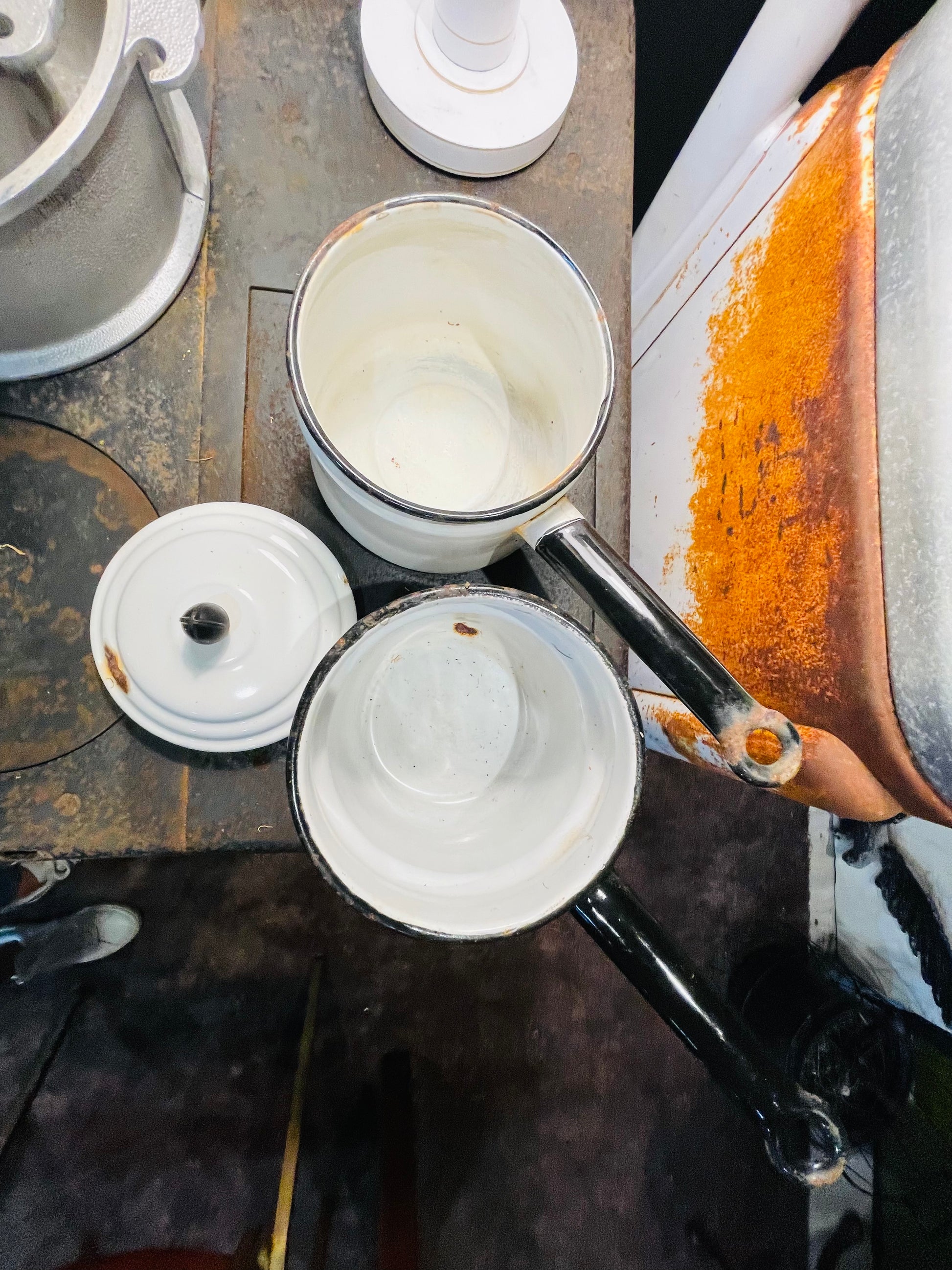 Vintage 1940’s Enamelware Double Broiler- White with Black Trim and Handle