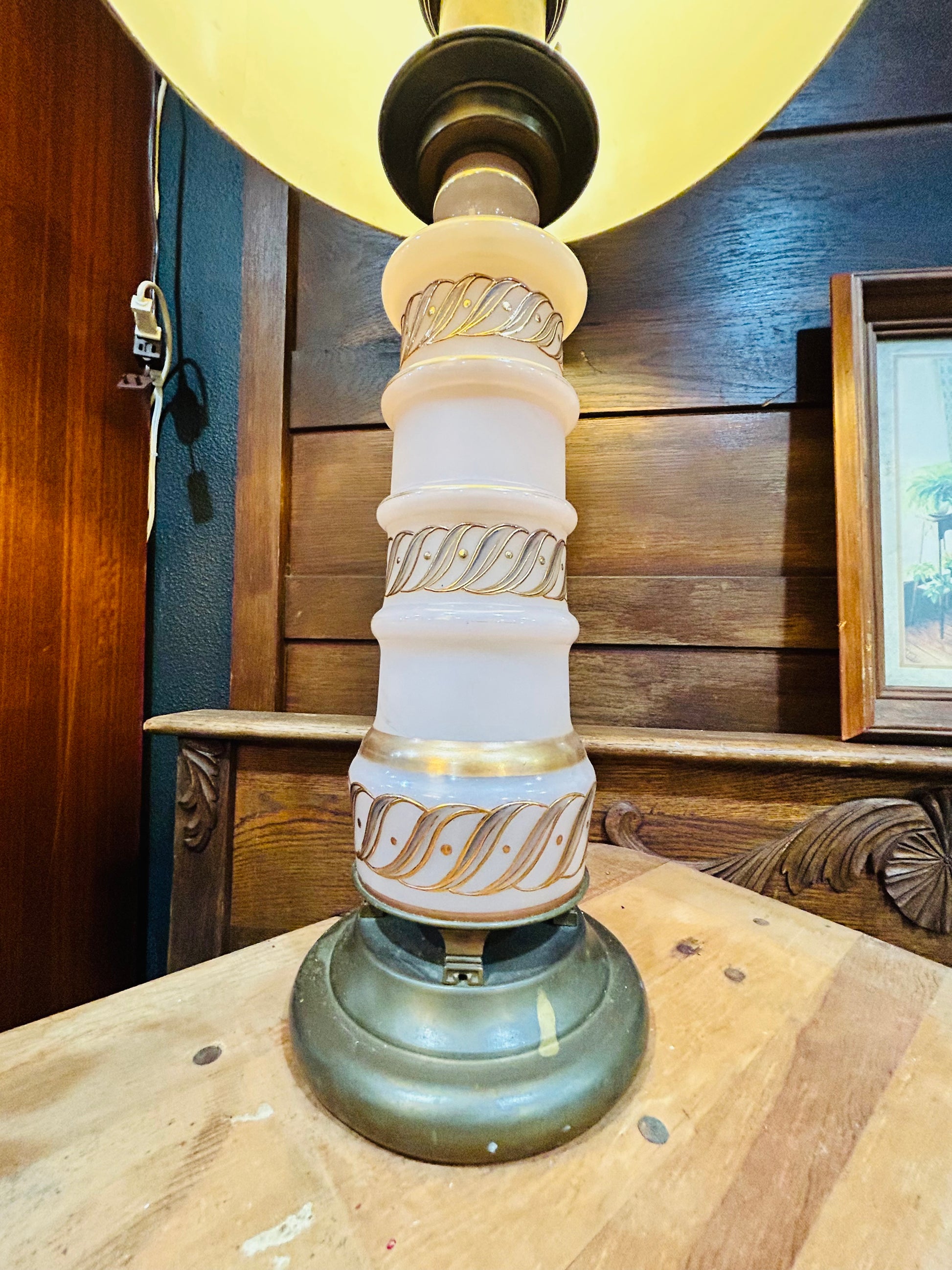 Vintage MCM Pink Glass and Brass Tall Table Lamp- Hand Painted Gold Accents